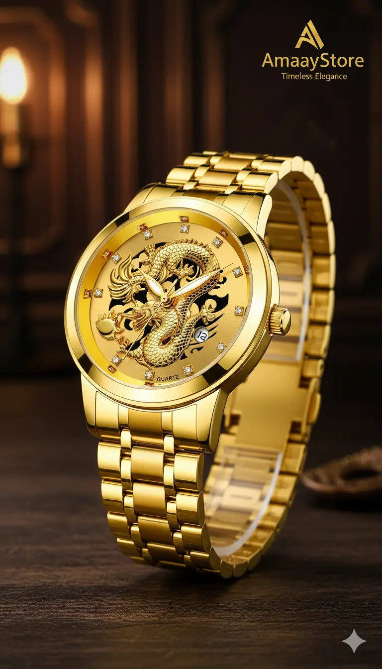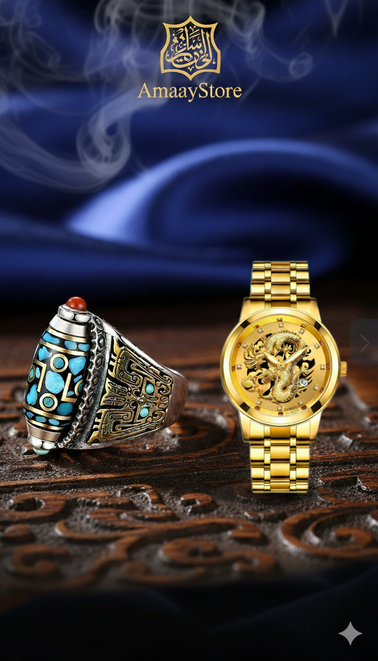 ✨ اجمع بين الفخامة والأناقةمع خاتم التنين المزخرف الدوار و ساعة التنين الذهبية الفاخرة.